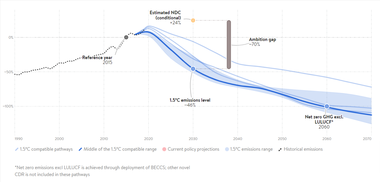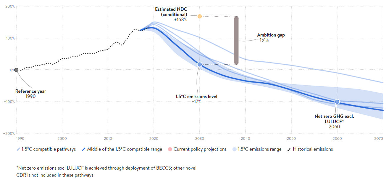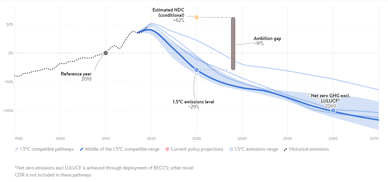 To align to 1.5°C compatible pathways, Sri Lanka needs to reduce its GHG emissions to 17-26 MtCO₂e/yr by 2030, or reductions of around 28-52% below 2015 levels by 2030, excluding LULUCF. With international support, Sri Lanka could adopt a more ambitious policy framework for scaling up renewable energy to enhance its energy security and independence.